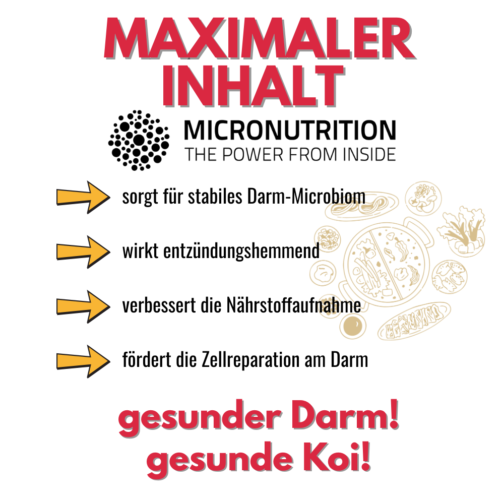 Dank seiner hochwertigen Inhaltsstoffe und großen Mengen an Premium Fischmehl, Mikronährstoffen und Immunstimulanzien garantiert dieses Futter ein außergewöhnliches Wachstum der Koi.
