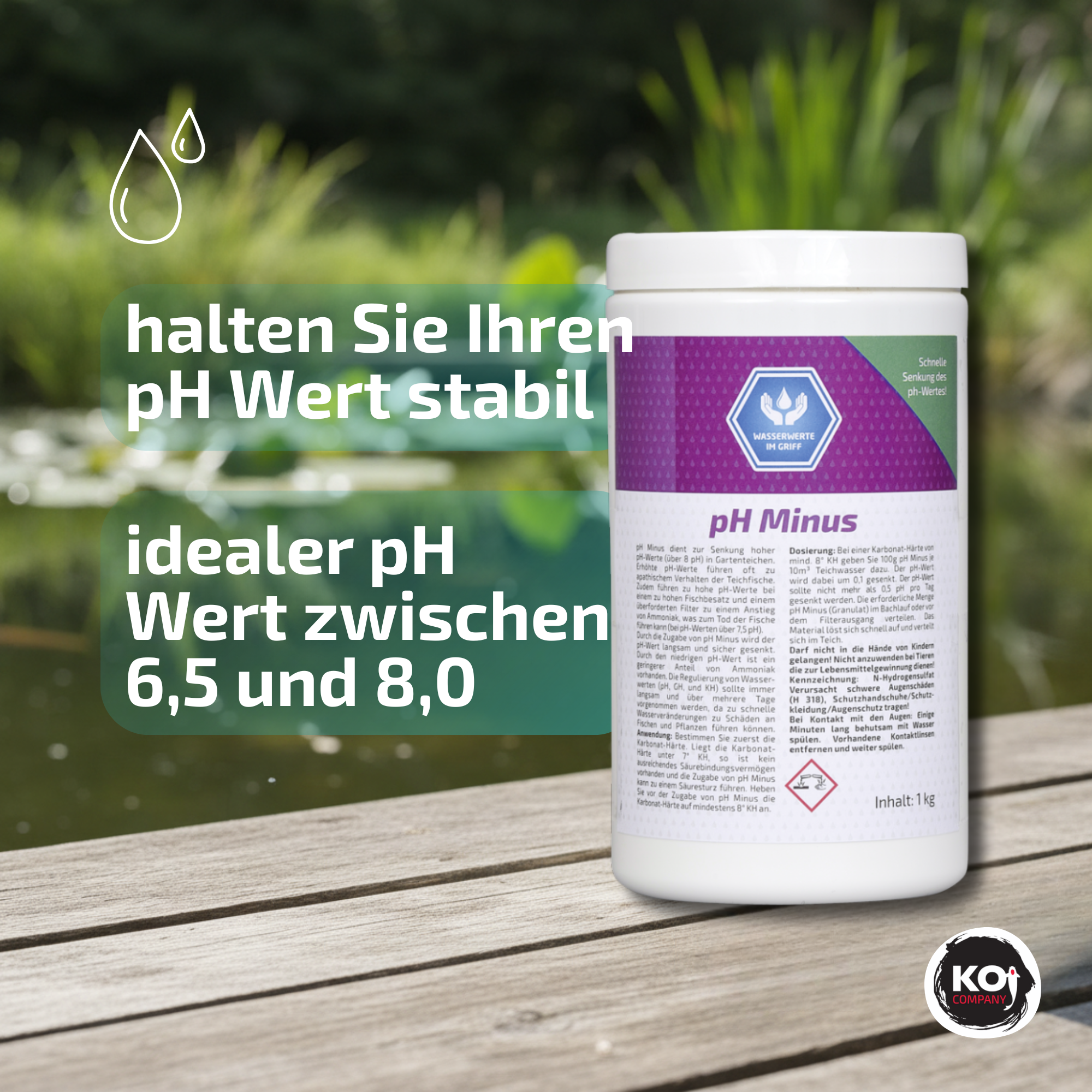 pH Minus dient zur Senkung hoher pH Werte (über 8 pH) in Gartenteichen. Durch den niedrigen pH-Wert ist ein geringerer Anteil von Ammoniak vorhanden.